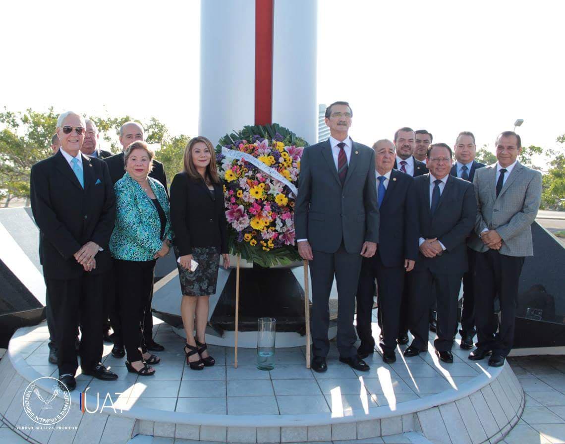 Desde temprana hora de este martes y ante la asistencia de estudiantes, profesores y directivos, el Rector Suárez Fernández puso en marcha los eventos conmemorativos con una Guardia de Honor y colocación de ofrendas florales en la Rotonda de los Fundadores y Hombres Ilustres de la UAT en el Centro Universitario Sur (CUS).