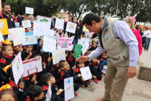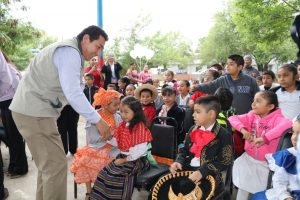 El alcalde Mario Alberto López Hernández, recibido con emoción por los alumnos de la primaria “Naciones Unidas”.