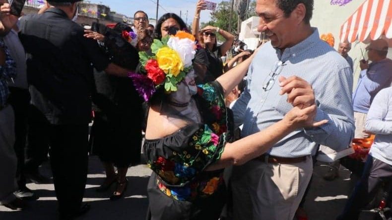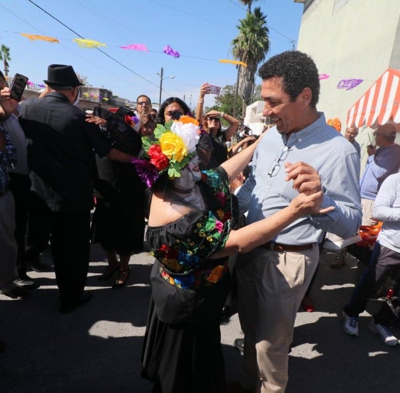 En el marco del tributo que se rinde a los muertos, el alcalde Mario Alberto López Hernández fue invitado a bailar una pieza de danzón por una catrina, figura representativa de la muerte