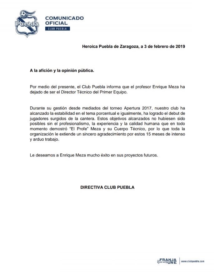 “El Club Puebla Informa que el profesor Enrique Meza ha dejado de ser el Director Técnico del Primer Equipo”, señala en un comunicado.