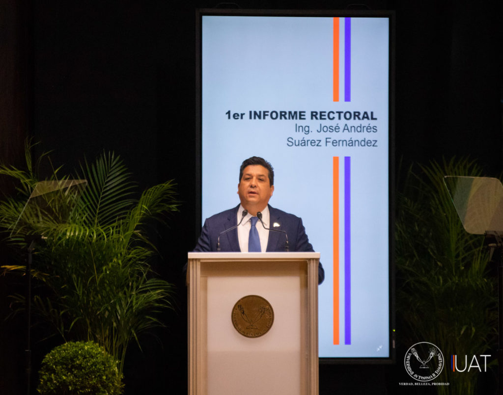 El mandatario estatal asistió como invitado de honor al primer informe presentado por el Rector José Andrés Suárez Fernández ante la Asamblea Universitaria, donde constató los avances que consolidan a la UAT como la institución de educación superior más grande e importante de Tamaulipas.