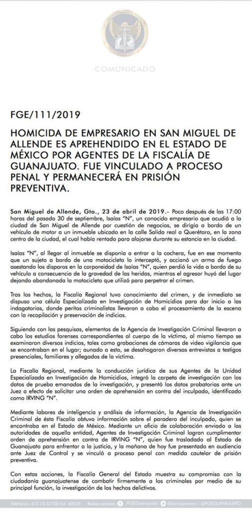 La Fiscalía General de Guanajuato informó que fue aprehendido Irving “N”, presunto asesino material de Isaías Gómez, empresario hotelero y quien era esposo de la actriz Sharis Cid.