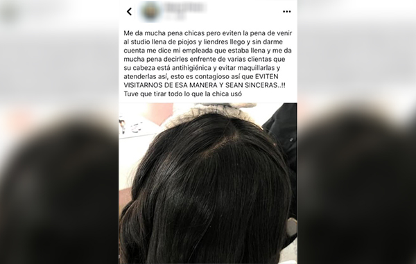 “Me da mucha pena chicas pero eviten la pena de venir al studio llena de piojos y sin darme cuenta me dice mi empleada que estaba llena y me da mucha pena decirles enfrente de varias clientas que su cabeza está antihigiénica y evitar maquillarlas y atenderlas así, esto es contagioso así que EVITEN VISITARNOS DE ESA MANERA Y SEAN SINCERAS…!!! Tuve que tirar todo lo que la chica usó”, escribió Mayra Pérez en su perfil de facebook.