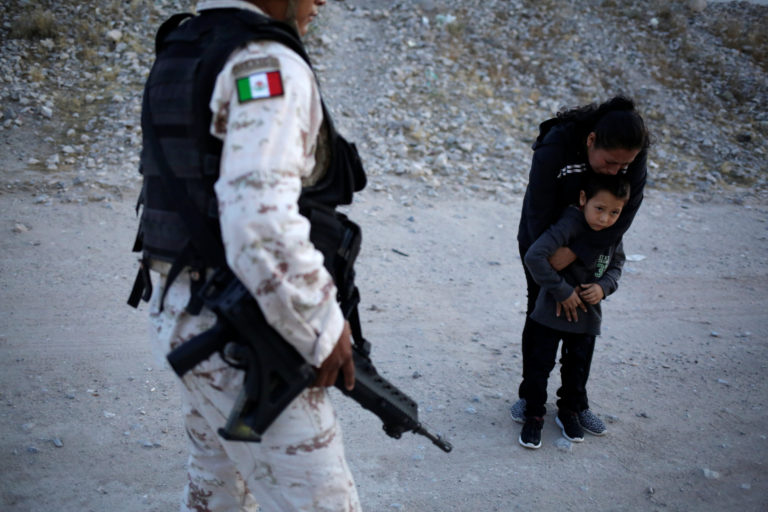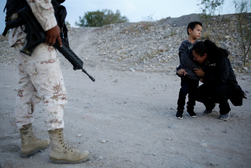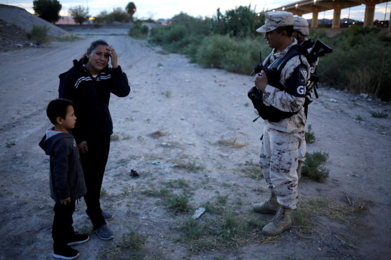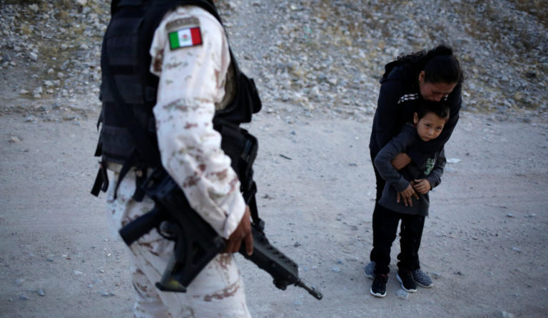 Niño migrante y su madre lloran frente a elementos de la Guardia Nacional