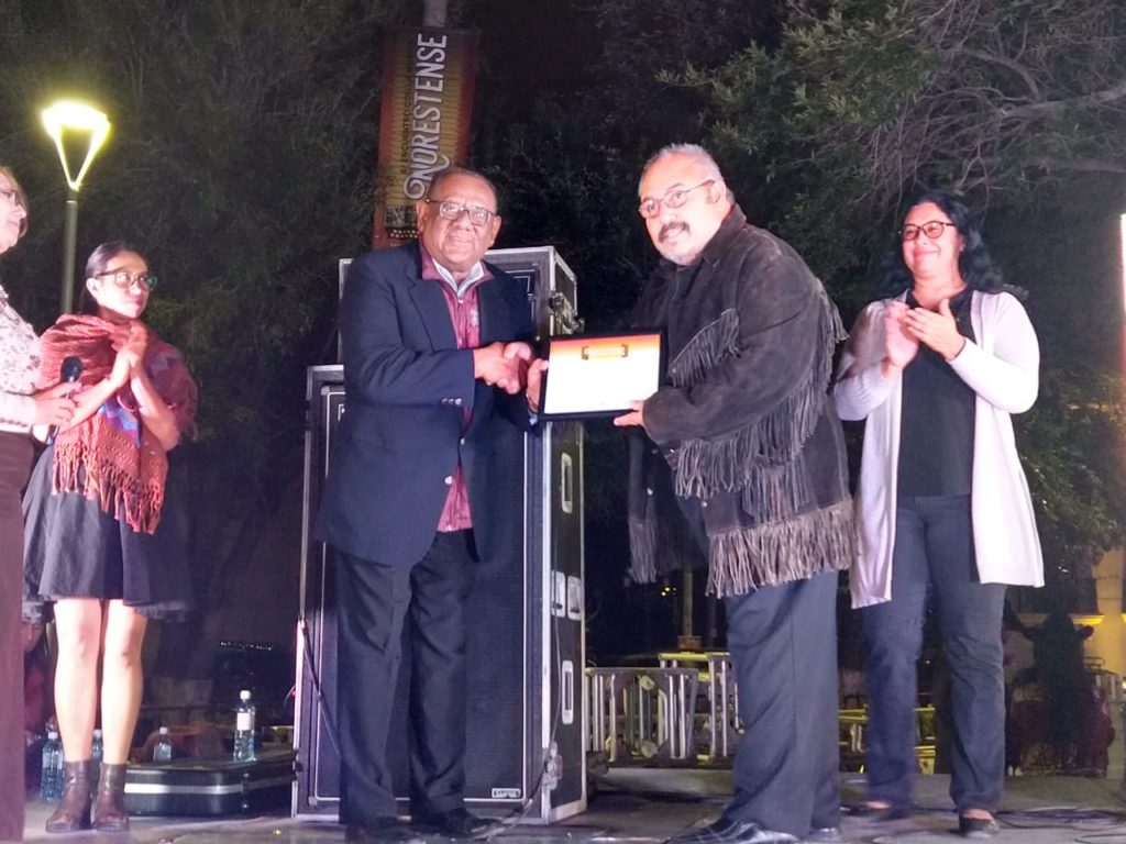 Con la representación del alcalde Mario Alberto López Hernández, el secretario de Educación, Cultura y Deporte, Alejandro Villafañez Zamudio entregó reconocimientos a los familiares de los integrantes del grupo Los Norteños de Río Bravo y de Pepe Charango, durante el homenaje póstumo que se les rindió en el marco del sexto Encuentro de Música Norestense.