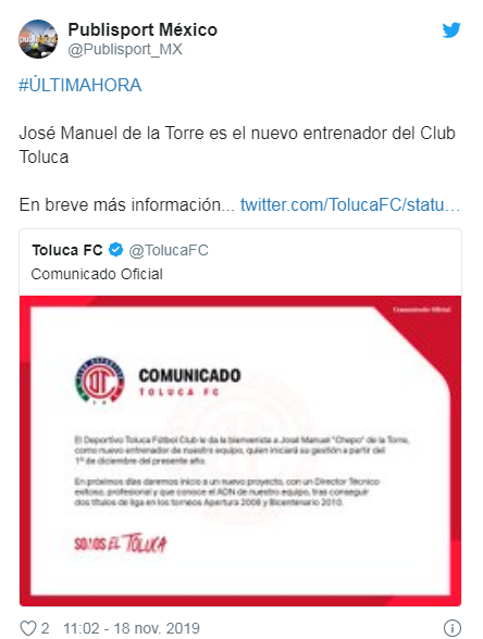 José Manuel de la Torre es nuevo entrenador del Club Toluca, así lo informó el equipo mediante un breve comunicado.