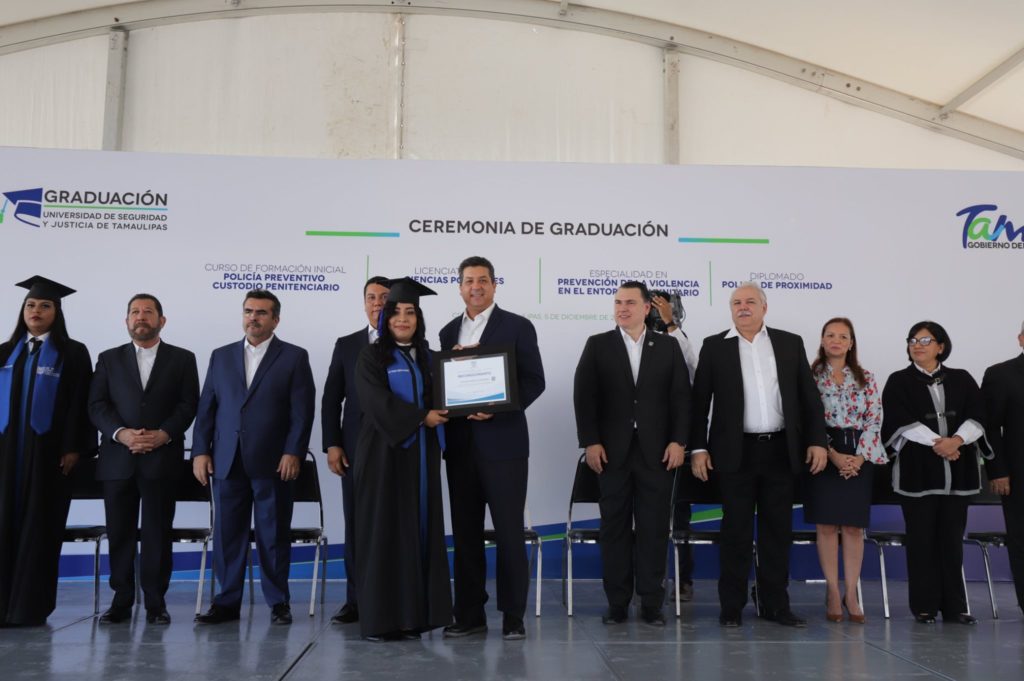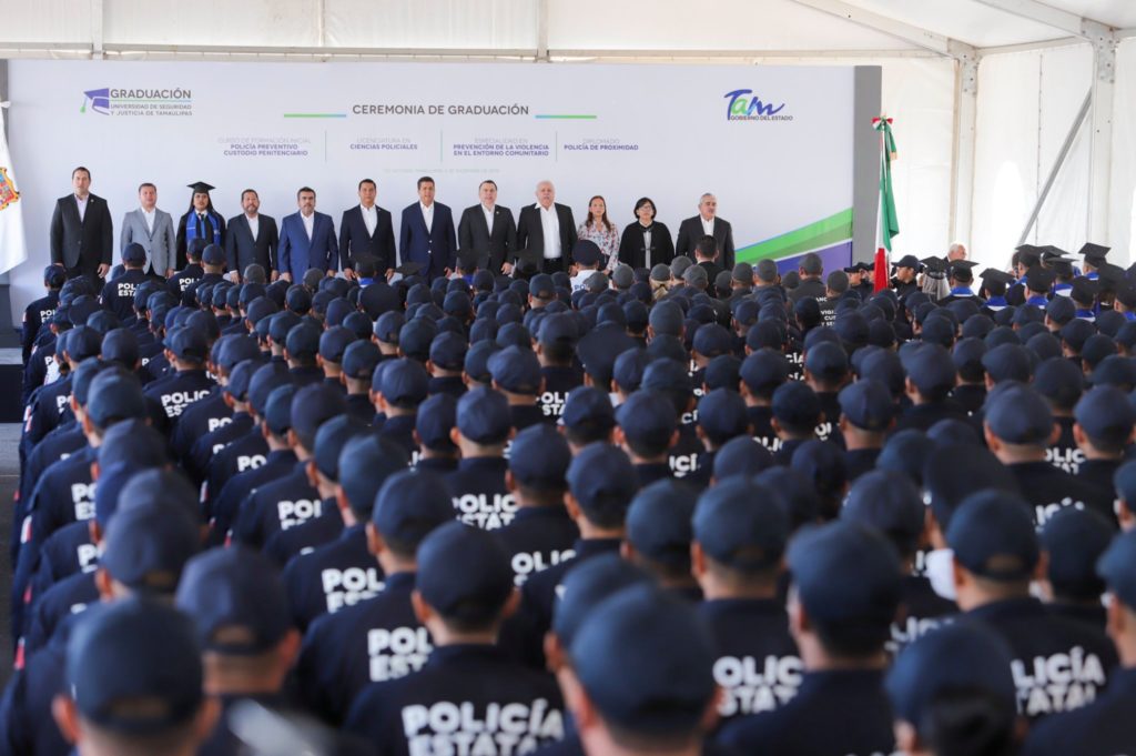 García Cabeza de Vaca presidió además la graduación de 537 nuevos cadetes y alumnos de la Universidad de Seguridad y Justicia de Tamaulipas, quienes llevaron el Curso de Formación Inicial para Policía Estatal y Custodio Penitenciario, Licenciatura en Ciencias Policiales, Especialidad en prevención de la Violencia en el Entorno Comunitario y el Diplomado “Policía de Proximidad”.