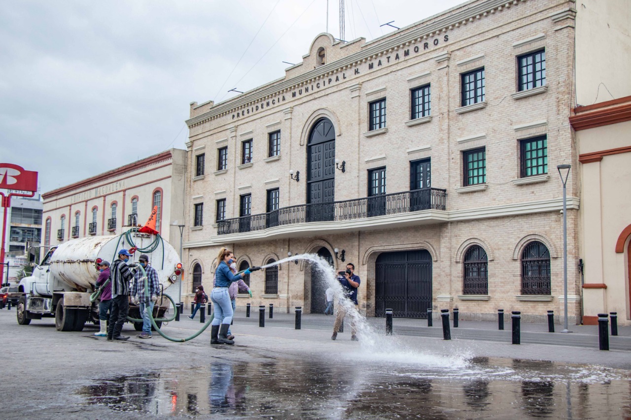 También se lavó el adoquín, acciones que estuvieron a cargo de 20 empleados de la citada dependencia, quienes al concluir se trasladaron a la Plaza Allende, ubicada también en el centro histórico de Matamoros para realizar un trabajo similar al de la plaza principal.