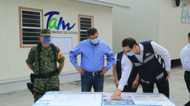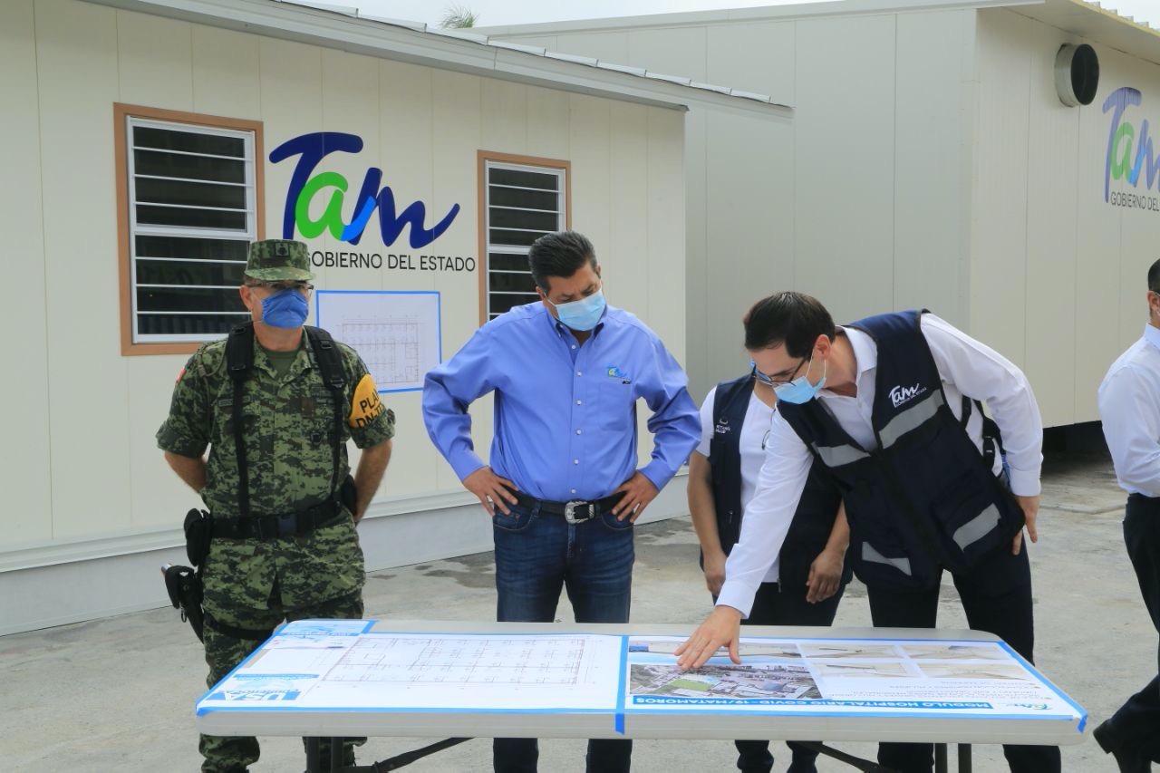 Se trata de uno de los ocho que se construyen en instalaciones Sistema Estatal de Salud en 7 municipios de Tamaulipas, y que en su conjunto ofrecerán 320 camas adicionales para atender a pacientes graves y muy graves por el coronavirus.