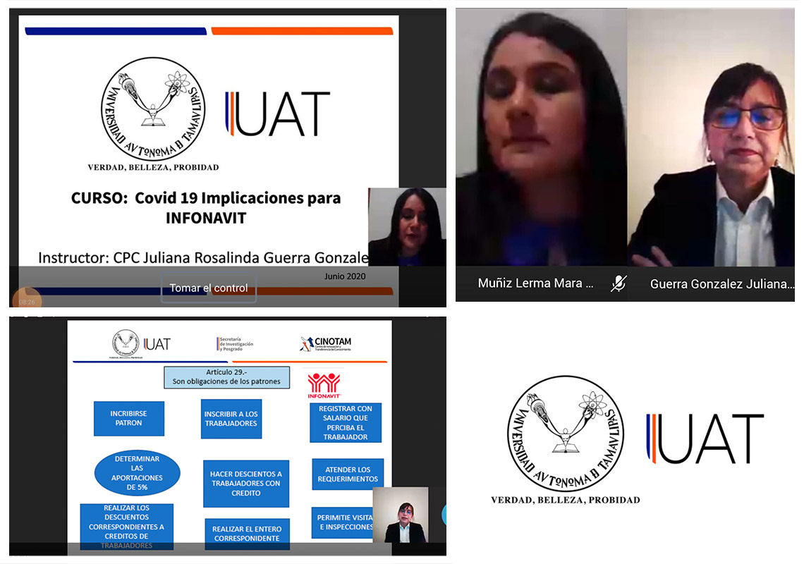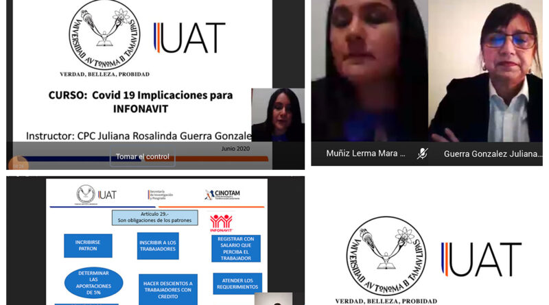 La Universidad Autónoma de Tamaulipas (UAT) llevó a cabo el curso en línea “Covid-19, implicaciones para Infonavit”, dirigido a las pequeñas y medianas empresas, con la finalidad de brindar actualización sobre este importante tema, mismo que fue impartido dentro del Programa de Apoyo a la Gerencia para su Desarrollo y Activación que se ofrece de manera gratuita por la plataforma de Microsoft Teams.