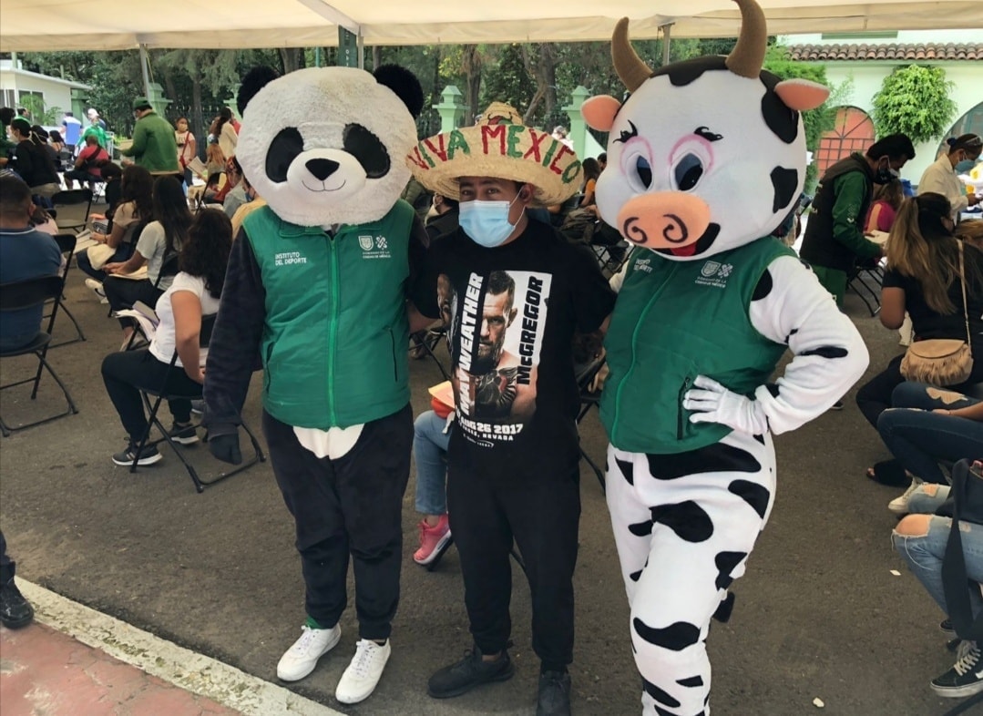 Al comenzar la jornada de vacunación de la segunda dosis de Sputnik-V para los jóvenes de 18 a 29 años en Campo Marte, Miguel Hidalgo, Vacuna y Pandemio realizaron diversos bailes para contagiar de ánimo a los recién inmunizados con canciones de reggaetón hasta de rock.