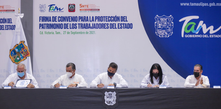 Ciudad Victoria, Tamaulipas.- Septiembre 27 del 2021.- A fin de dar certeza a las futuras pensiones y jubilaciones de más de 50 mil trabajadores en activo y garantizar la viabilidad financiera del Instituto Tamaulipeco de Previsión y Seguridad Social del Estado de Tamaulipas (IPSSET), el gobernador Francisco García Cabeza de Vaca firmó este lunes un convenio con los líderes del SUTSPET, Blanca Guadalupe Valles Rodriguez, del SNTE Rigoberto Guevara Vazquez y el titular del IPSSET, Leonel Salinas Martínez.