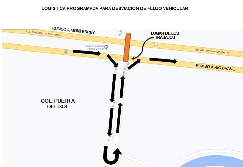 Este cierre es derivado de los trabajos de construcción en el colector, que consiste en la instalación de tubería de PVC sanitario de 36 pulgadas de diámetro en la calle Punta Sol, entre libramiento Matamoros-Monterrey y la Estación de Bombeo de Aguas Residuales 22 (EBAR) en la colonia Puerta del Sol.