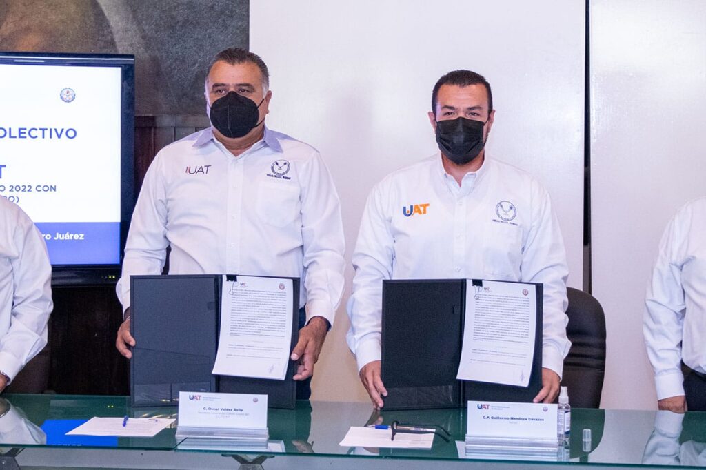 El Rector de la Universidad Autónoma de Tamaulipas (UAT), C. P. Guillermo Mendoza Cavazos, presidió la firma del Contrato Colectivo Laboral 2022, que establece el incremento salarial con retroactivo al mes de enero de este año.