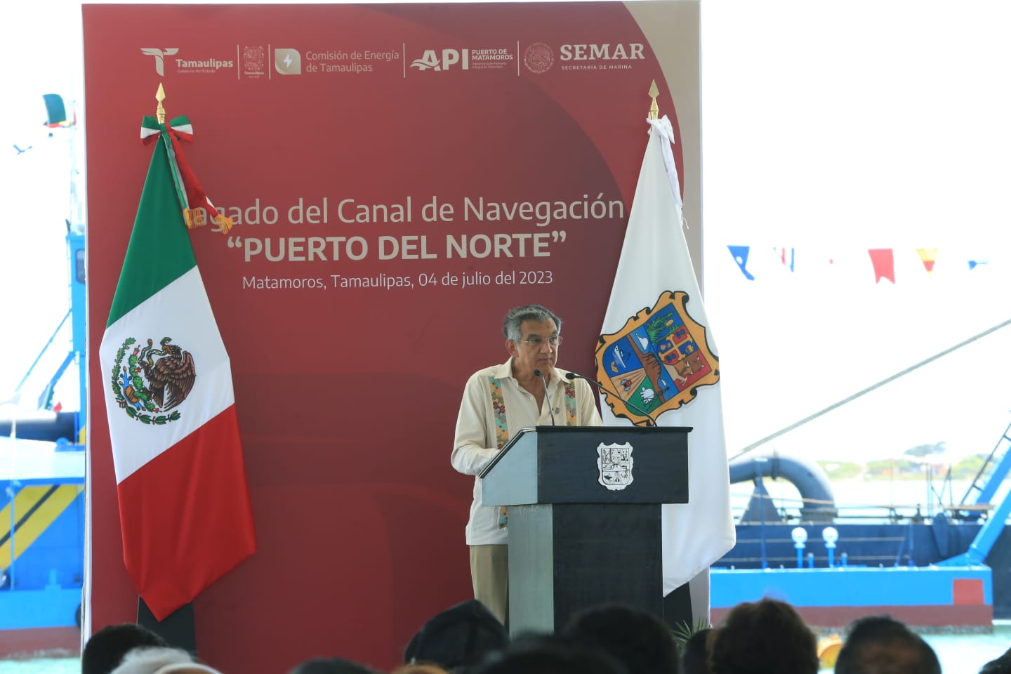 Actualmente, dijo, se llevan a cabo las obras de dragado hasta doce metros de profundidad en su canal de navegación, con una inversión de mil 200 millones de pesos y a la vez agradeció a la Secretaría de Marina y a su titular, almirante José Rafael Ojeda Durán, el apoyo brindado a la infraestructura portuaria de Tamaulipas.