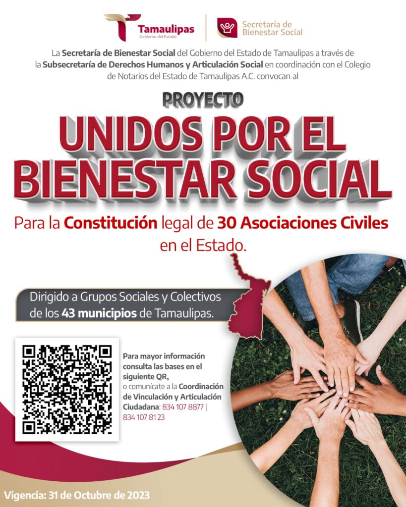 Ciudad Victoria.- La Secretaría de Bienestar Social (SEBIEN), ha lanzado la convocatoria “Unidos por el Bienestar Social” en Tamaulipas. El propósito es formalizar legalmente a las organizaciones como Asociaciones Civiles, lo que les permitirá una mayor participación en la sociedad.