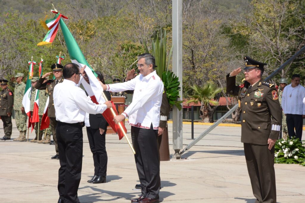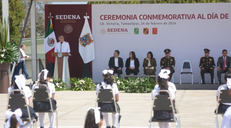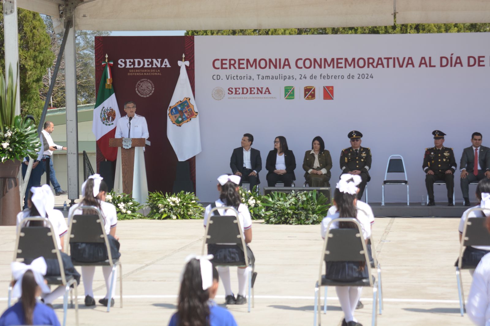 Ante la presencia del comandante de la Cuarta Región Militar, Maximiliano Cruz Ramos, y del comandante de la 48/a Zona Militar, Julio César Islas Sánchez, representantes de los Poderes Legislativo y Judicial, así como de alumnas y alumnos, el gobernador señaló la importancia de que el festejo por la bandera nacional tenga un significado más fuerte y duradero, y que sea una invitación al civismo, a los valores, a la solidaridad, a la participación social, al amor por México y por Tamaulipas.