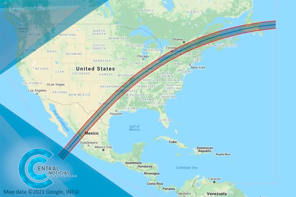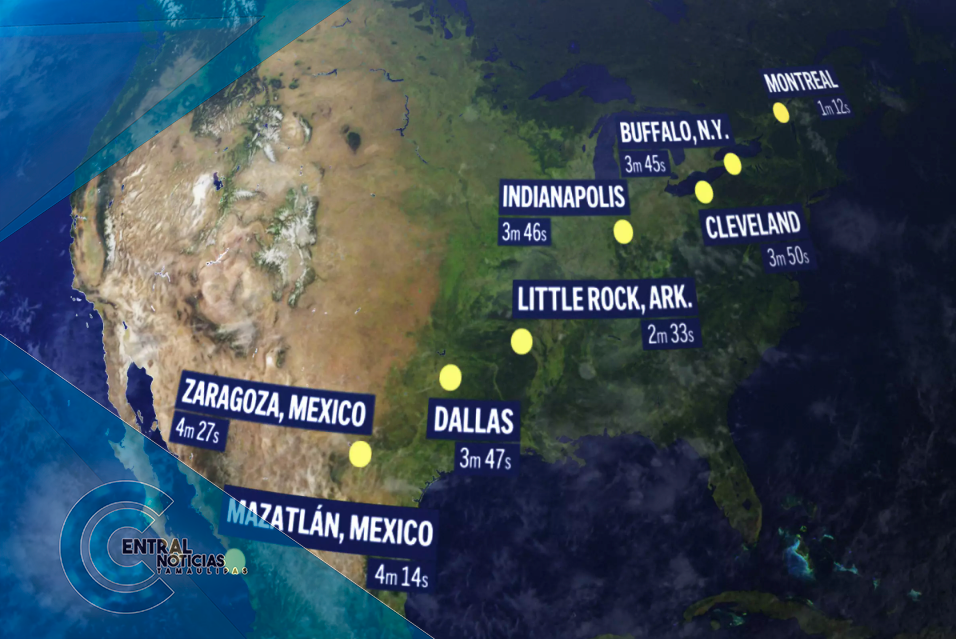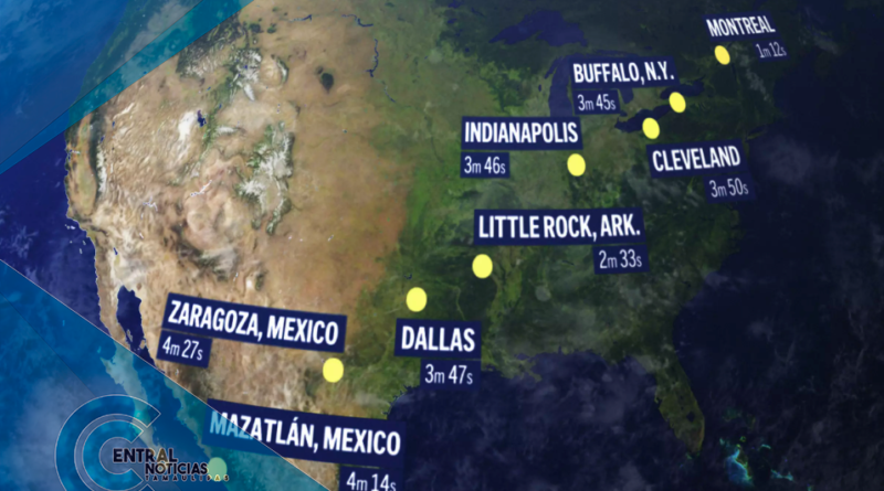 En Estados Unidos ingresará a través de Texas, y se trasladará a Oklahoma, Arkansas, Missouri, Illinois, Kentucky, Indiana, Ohio, Pensilvania, Nueva York, Vermont, New Hampshire y Maine. Algunas partes de Tennessee y Michigan también podrán ver el evento.