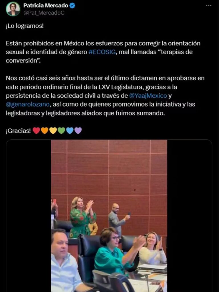 Patricia Mercado, senadora de Movimiento Ciudadano y una de las legisladoras que impulsaron la discusión de la iniciativa, fue de las primeras en celebrar la aprobación de la reforma, reconociendo el trabajo de la organización Yaaj México, dedicada a promover y defender los derechos de la comunidad LGBT+.
