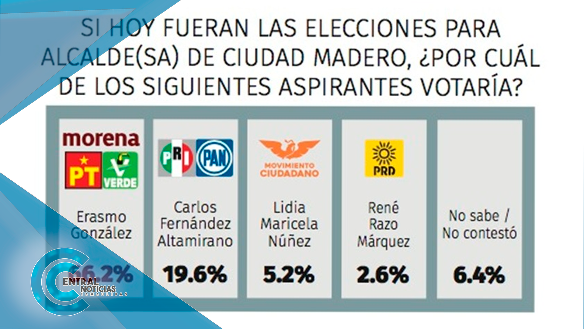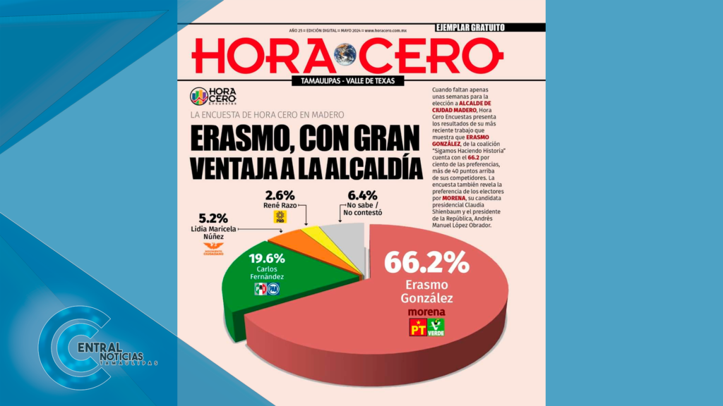 Ciudad Madero, Tam.- A menos de un mes de la elección, Erasmo González, candidato de la coalición “Sigamos Haciendo Historia” a la alcaldía de Ciudad Madero, aparece como el favorito de los electores para ganar los comicios al contar con una ventaja de 46.6 puntos porcentuales.