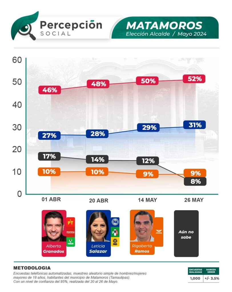 Esta encuesta fue realizada a través de 1000 llamadas telefónicas con un margen de error de +/-3.5%, con un nivel de confianza del 95% y realizada del 20 al 26 de mayo en la ciudad de Matamoros.