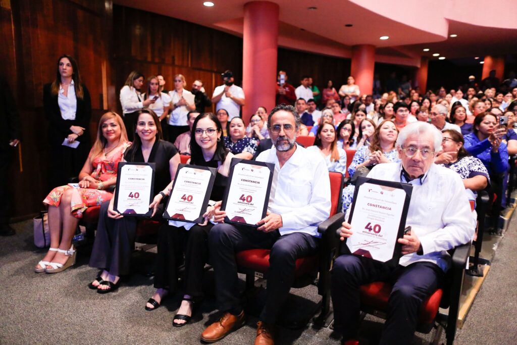 Al clausurar el Simposio Médico “Por la Alegría de Verlos Sanos”, realizado en el marco de esta celebración, en una emotiva ceremonia efectuada en el teatro Amalia G. de Castillo Ledón y acompañado por el secretario de Salud, Vicente Joel Hernández Navarro, el gobernador entregó reconocimientos a diez exdirectores de este centro médico, así como a profesionistas y trabajadores con 40 años de servicio y a los seis ponentes que participaron en el simposio.