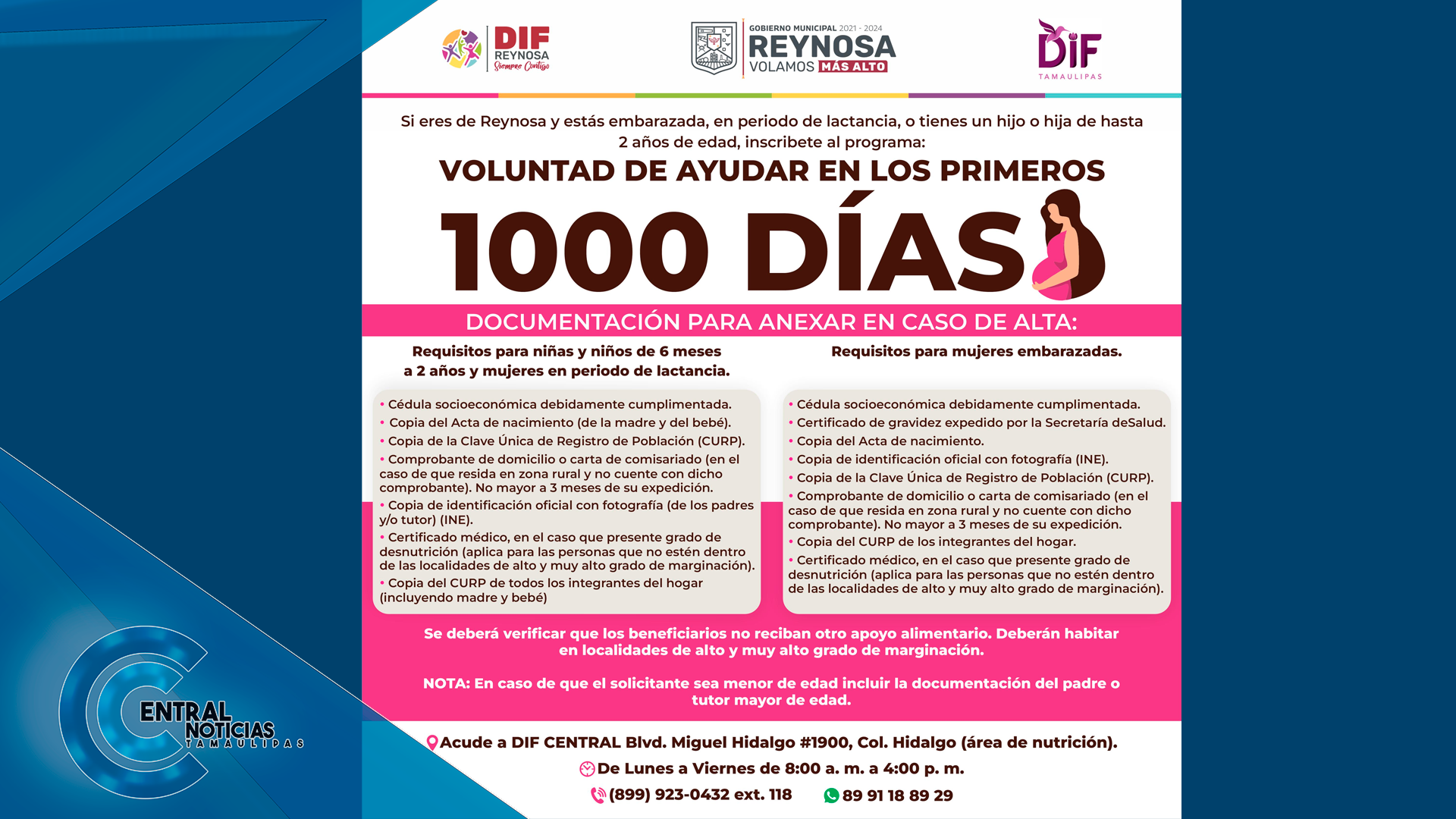 El Sistema DIF Reynosa, presidido por Carlos Luis Peña Garza, invita a los ciudadanos a registrarse al programa del DIF Tamaulipas “Voluntad de Ayudar en los Primeros 1000 Días”, dirigido a mujeres embarazadas, en periodo de lactancia, así como a niñas y niños de hasta dos años de edad.