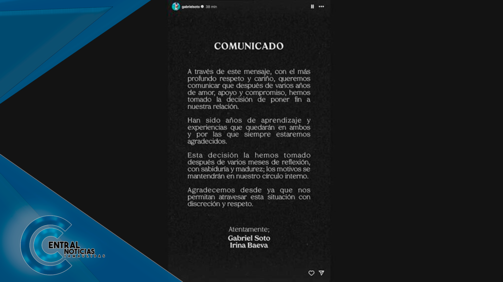 Gabriel Soto publicó el comunicado en las historias de su cuenta oficial de Instagram, destacando el respeto y cariño con el que han manejado esta decisión. De esta manera, los actores concluyeron una etapa significativa en sus vidas personales y profesionales.