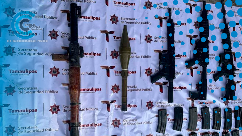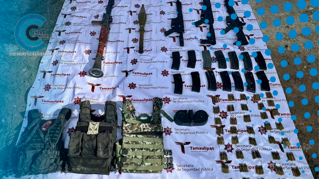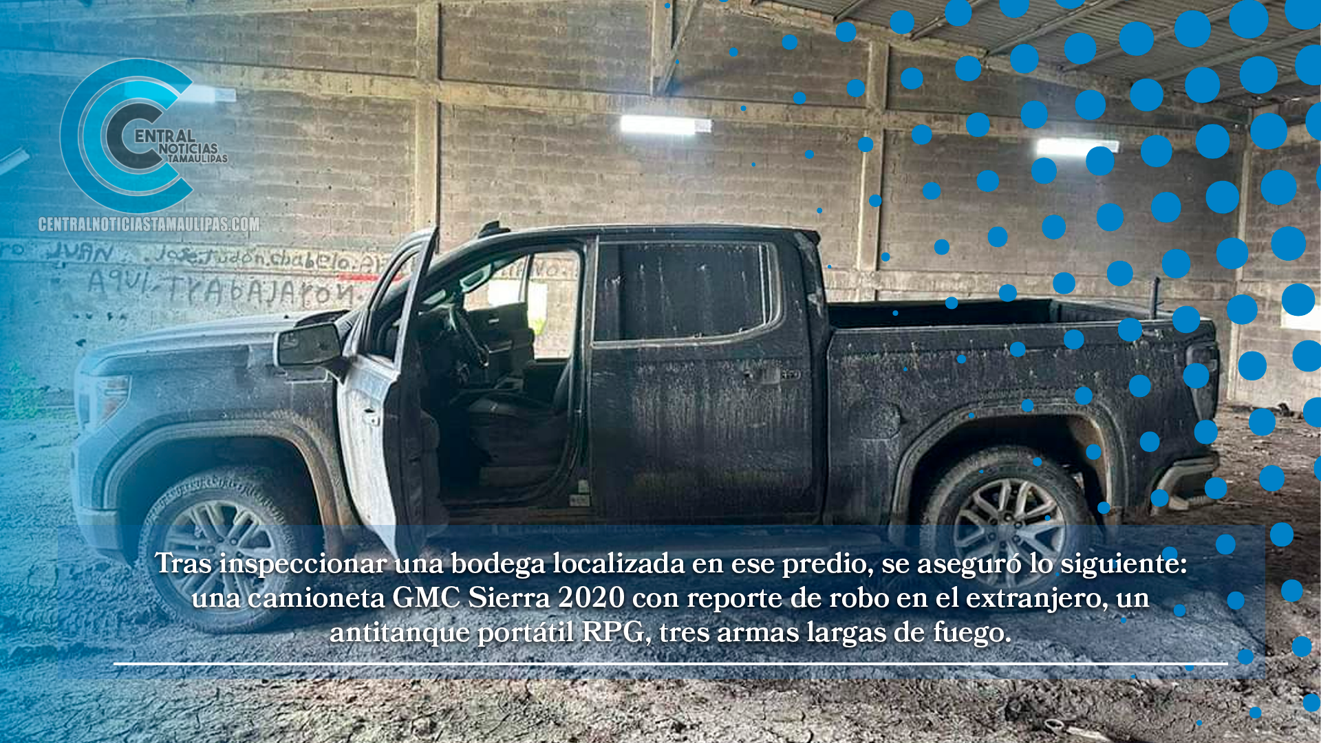 Tras inspeccionar una bodega localizada en ese predio, se aseguró lo siguiente: una camioneta GMC Sierra 2020 con reporte de robo en el extranjero, un antitanque portátil RPG, tres armas largas de fuego, dos chalecos tácticos con insignias al grupo delictivo ‘’C.D.G. Escorpión’’, un chaleco táctico color verde con camuflaje y placas metálicas, 14 cargadores, un cargador tipo tambor y 193 cartuchos.