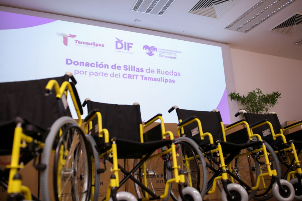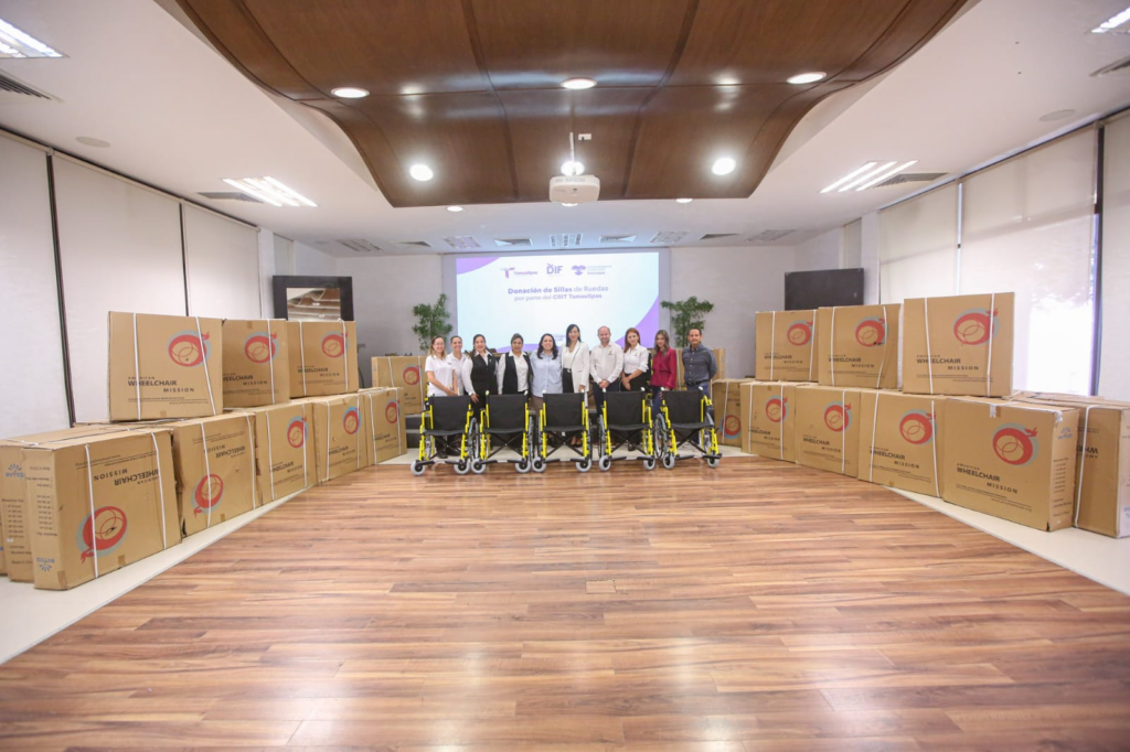 Ciudad Victoria, Tamaulipas.- El Centro de Rehabilitación e Inclusión Infantil Teletón de Tamaulipas (CRIT), llevó a cabo un donativo consistente en 59 sillas de ruedas al Sistema para el Desarrollo Integral de la Familia de Tamaulipas que preside la doctora María de Villarreal, que serán de gran utilidad para las personas que más las requieran y que se encuentren con algún grado de vulnerabilidad.