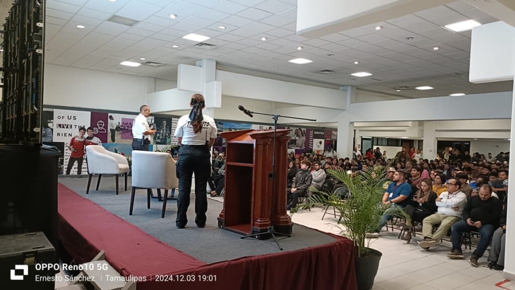Matamoros, Tamaulipas – La Dirección de Tránsito y Vialidad de Matamoros, encabezada por el Lic. José Luis García, en coordinación con la Secretaría de Seguridad Pública Municipal dirigida por el Lic. Eduardo Jeu Silva Capistrán, impartió una conferencia sobre cultura vial a mil 500 estudiantes de la Universidad Tecnológica de Matamoros (UTM).