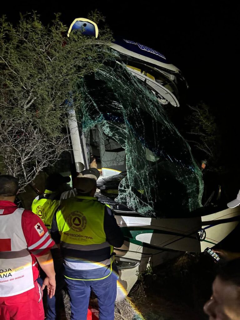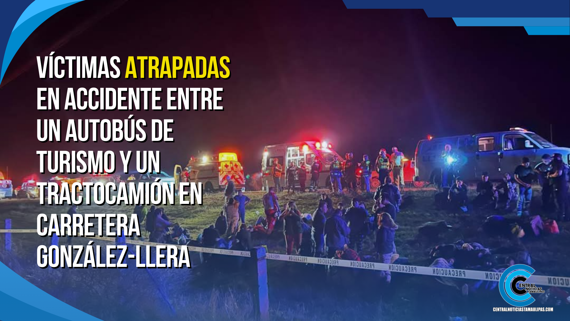González, Tamaulipas. Un aparatoso accidente entre un autobús de turismo y un tractocamión movilizó este viernes a diversas corporaciones de auxilio en el kilómetro 47 de la carretera 81, tramo González-Llera.