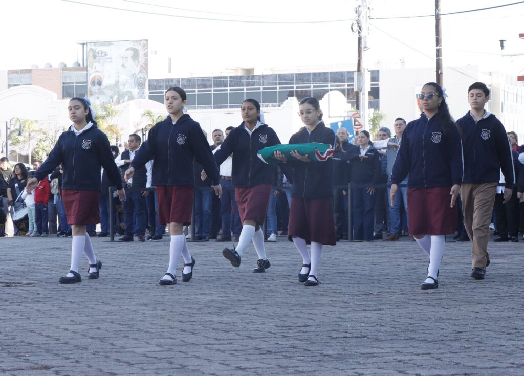 Luego del acto protocolario, alumnos de la escuela secundaria general No. 2 “20 de Noviembre” representaron un recorrido por la historia de este símbolo patrio, desde el estandarte virreinal del siglo XVII hasta la actualidad.