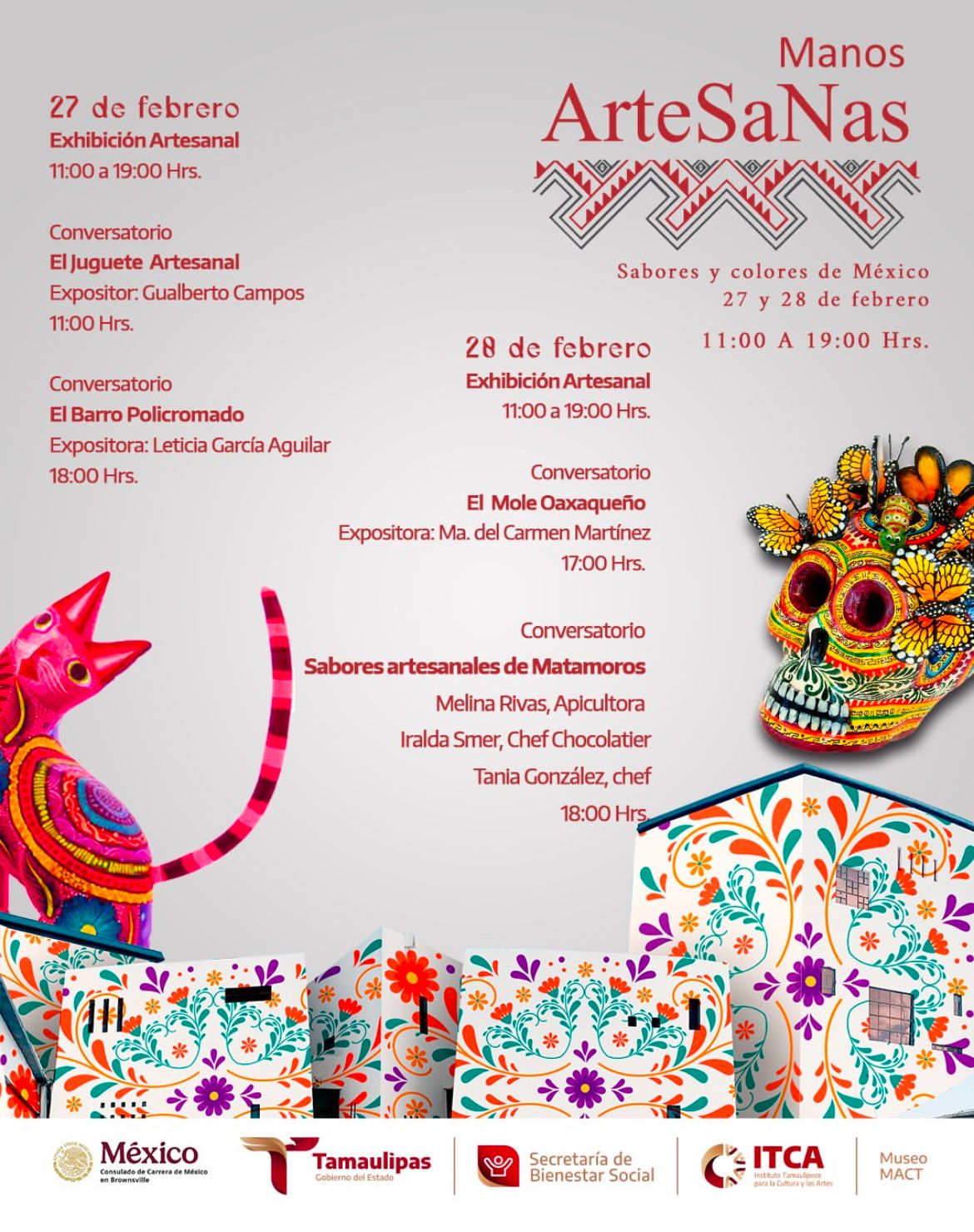 Este jueves 27 y viernes 28 de febrero en el Museo de Arte Contemporáneo de Tamaulipas se llevará a cabo la segunda edición de Manos ArteSaNas “Colores y Sabores de México”, con una exposición de artesanías de Oaxaca, Estado de México, Morelos e Hidalgo, así como 4 conversatorios con especialistas en el tema.