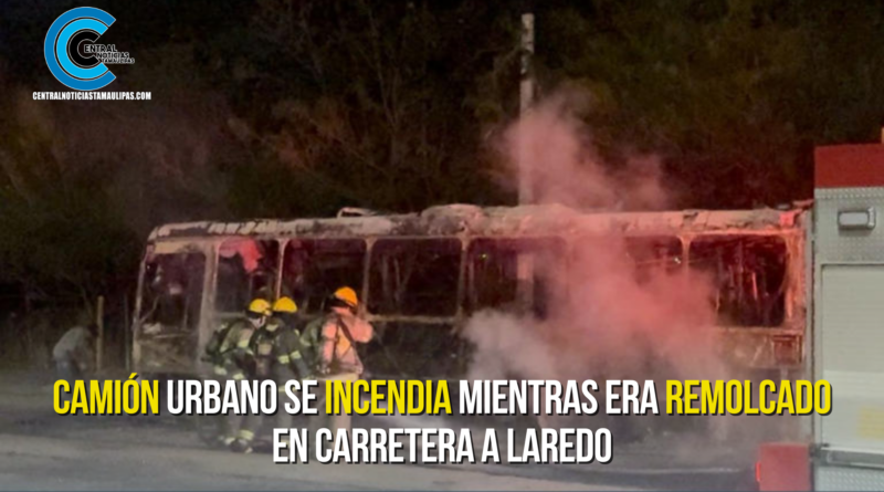 Camión urbano se incendia mientras era remolcado en carretera a Laredo