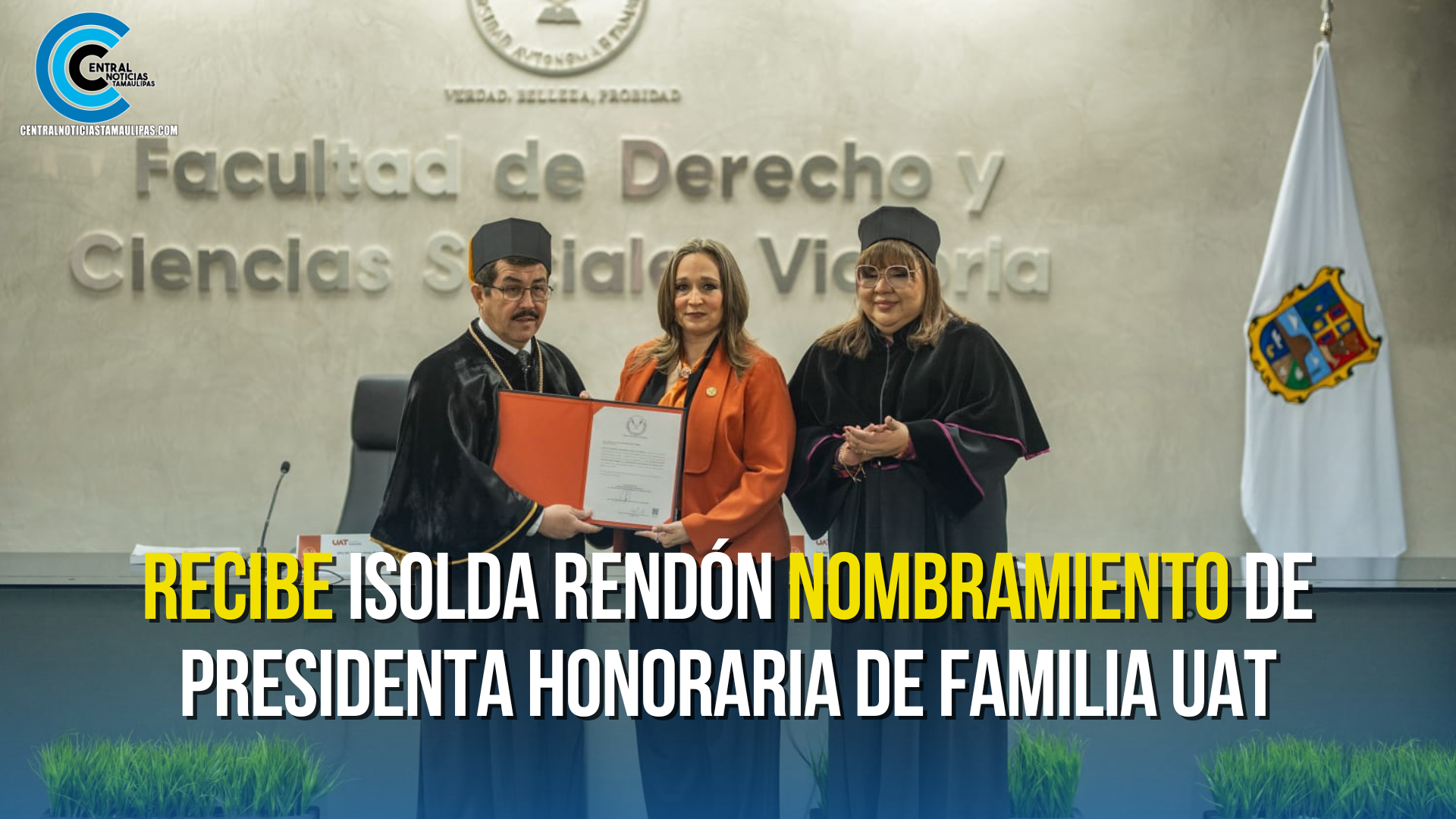 En el marco de la Asamblea Solemne de la Universidad Autónoma de Tamaulipas, el rector Dámaso Anaya Alvarado entregó el nombramiento como presidenta honoraria de Familia UAT, a la Lic. Isolda Rendón Monterrey, destacando su liderazgo en iniciativas que fortalecen la unidad y el bienestar de la comunidad universitaria.