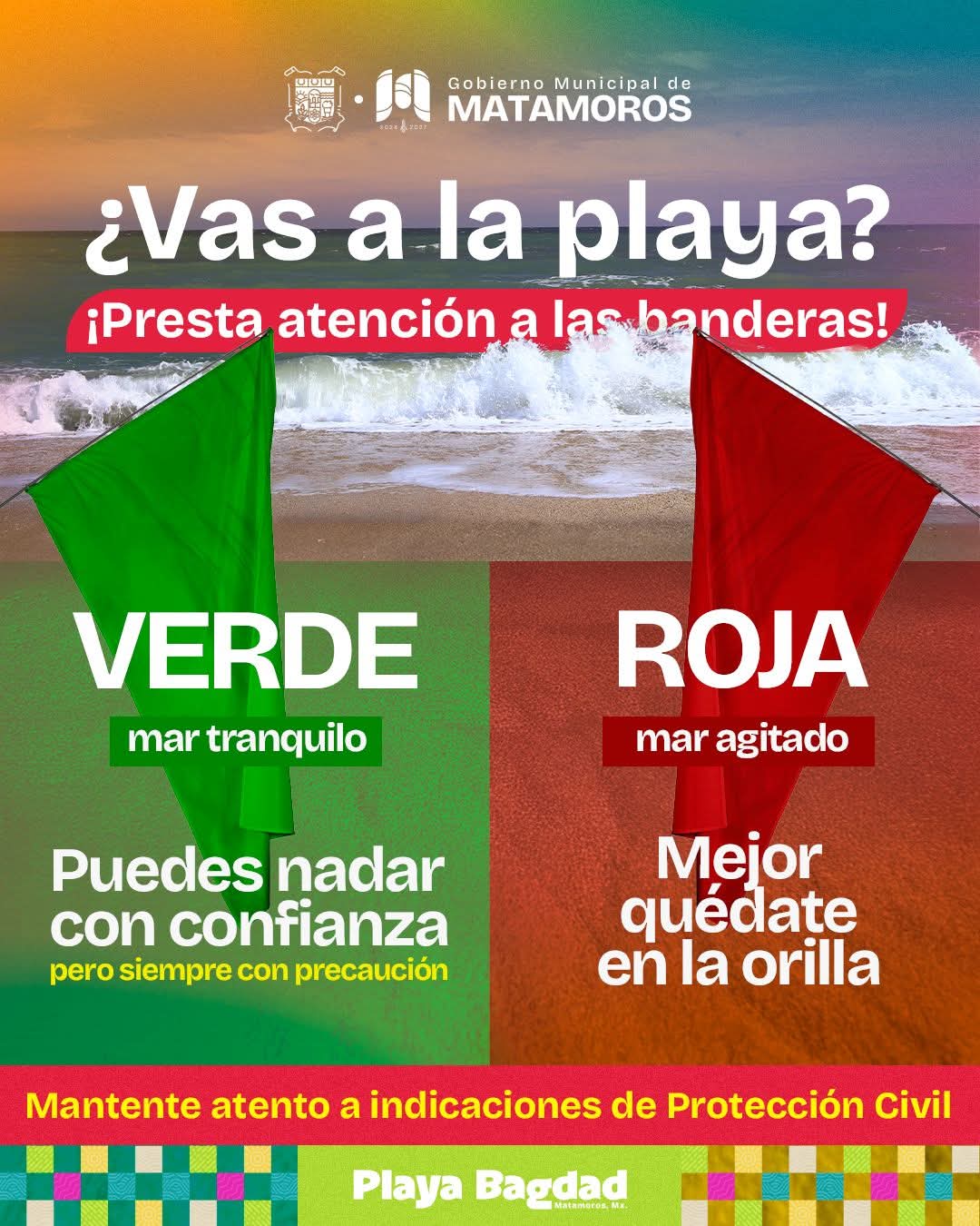 El gobierno municipal convoca a la ciudadanía y a los visitantes a mantenerse atentos al color de la bandera que se coloque en Playa Bagdad, ahora que inicia la temporada vacacional.