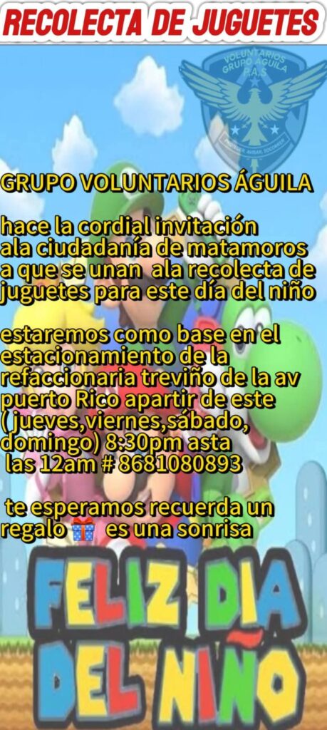 La agrupación hace un llamado a la solidaridad de los matamorenses para que se sumen a esta noble causa. Este jueves a las 8:00 de la noche, los voluntarios estarán recibiendo donativos en especie —principalmente juguetes nuevos o en buen estado— en la Refaccionaria Treviño, ubicada sobre la avenida Puerto Rico.