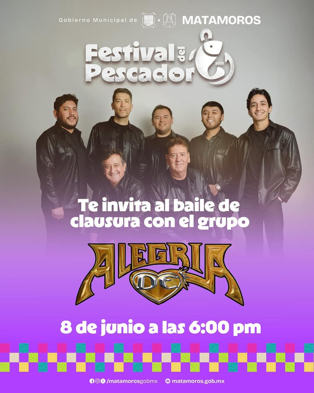 El Gobierno municipal de Matamoros, a través de la Direción de turismo, invita cordialmente a toda la ciudadanía a participar en el gran cierre del Festival del Pescador, una celebración que ya es tradición que da orgullo por nuestras raíces. El gran cierre de actividades estará a cargo del grupo “Alegría de Corazón”.