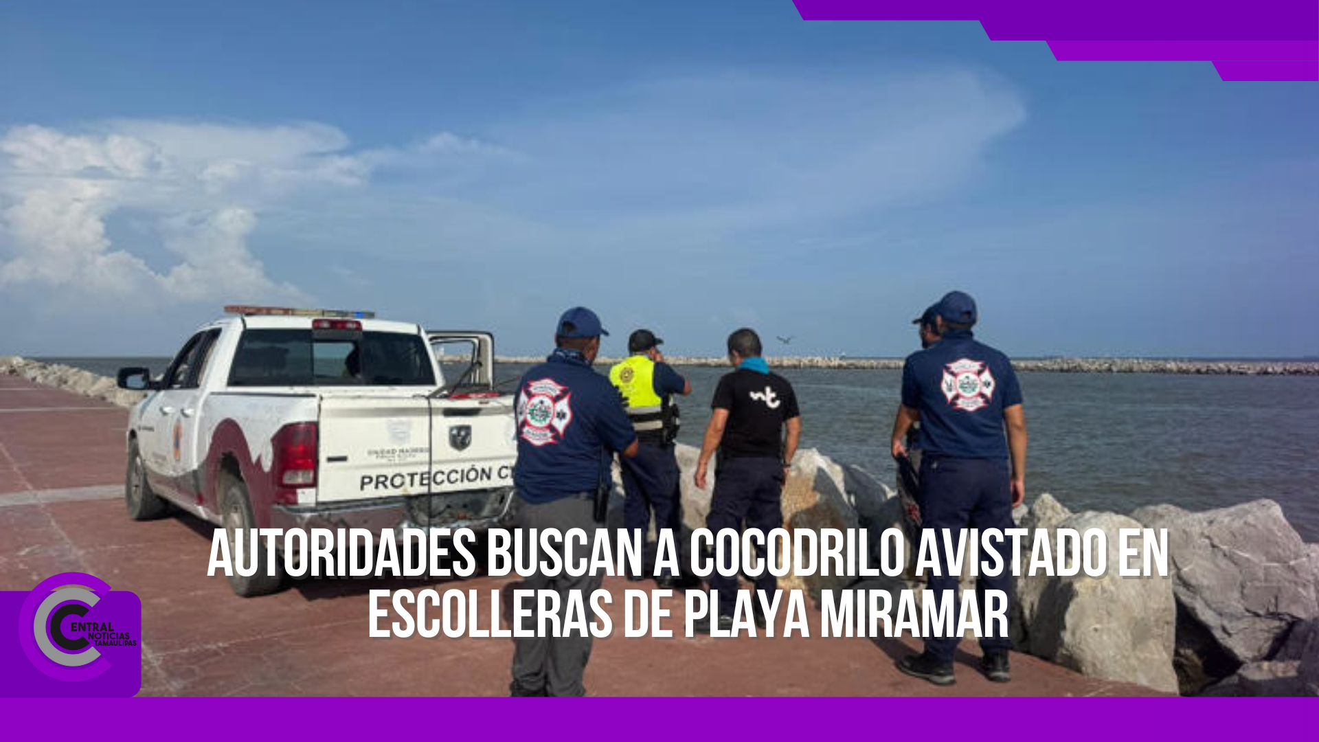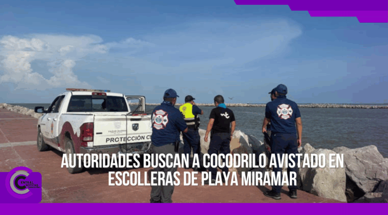 Elementos de la Secretaría de Marina, Protección Civil y Bomberos mantienen un operativo activo para ubicar y controlar a un cocodrilo de más de dos metros de longitud, observado esta tarde en la zona de escolleras de Playa Miramar, en el sector que colinda con el río Pánuco.