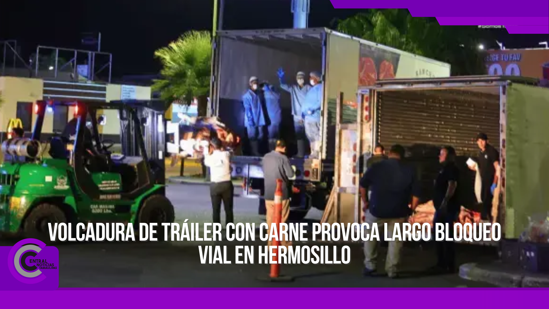 Volcadura de tráiler con carne provoca largo bloqueo vial en Hermosillo