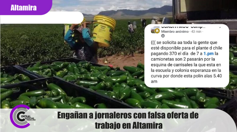 Altamira, Tamaulipas.- Un grupo de jornaleros de la zona rural de Villa Cuauhtémoc, en Altamira, fueron víctimas de un engaño luego de que circulara en redes sociales una supuesta oferta laboral en plantaciones de chile, con un pago de 370 pesos por jornada, cifra superior a los 300 pesos que normalmente reciben por este tipo de trabajo.