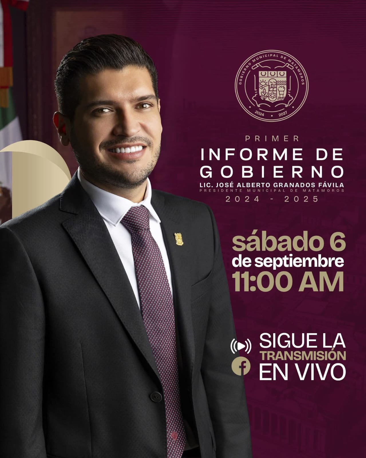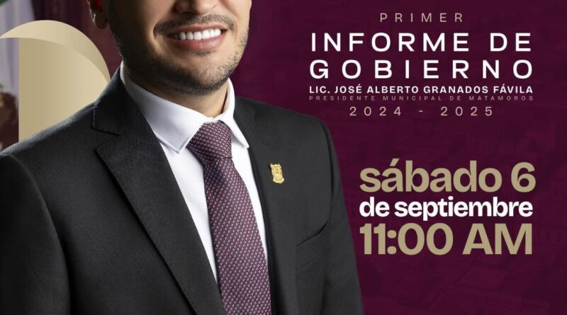 Este sábado 6 de septiembre, en punto de las 11:00 de la mañana, el Presidente Municipal de Matamoros, Beto Granados, llevará a cabo la presentación de su Primer Informe de Gobierno, acto que representa un importante ejercicio de transparencia y rendición de cuentas ante la ciudadanía.