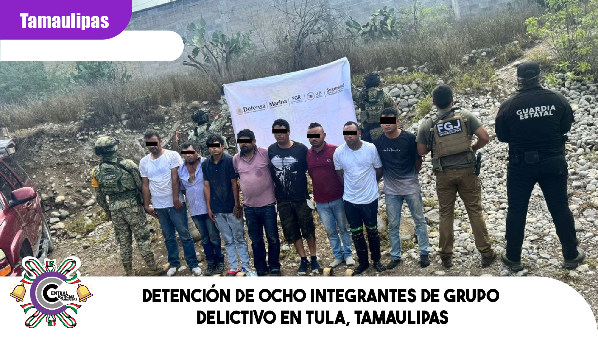 El Gobierno del Estado de Tamaulipas informa que en un Operativo Conjunto, Agentes de la Secretaría de la Defensa Nacional (SEDENA), la Fiscalía General de Justicia del Estado de Tamaulipas y de la Guardia Estatal, detuvieron en el municipio de Tula a ocho personas integrantes de un grupo delictivo que opera en la región.