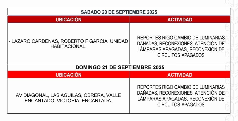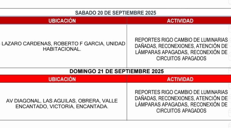 El Gobierno de Beto Granados estará trabajando en las siguientes zonas para que nuestras calles estén más seguras e iluminadas.