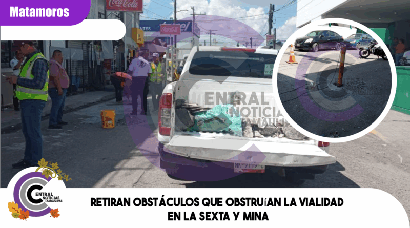 La tarde de este miércoles 1 de octubre, elementos de Tránsito y Vialidad realizaron el retiro de barras metálicas que obstruían el libre tránsito en la intersección de la calle Sexta y Mina.