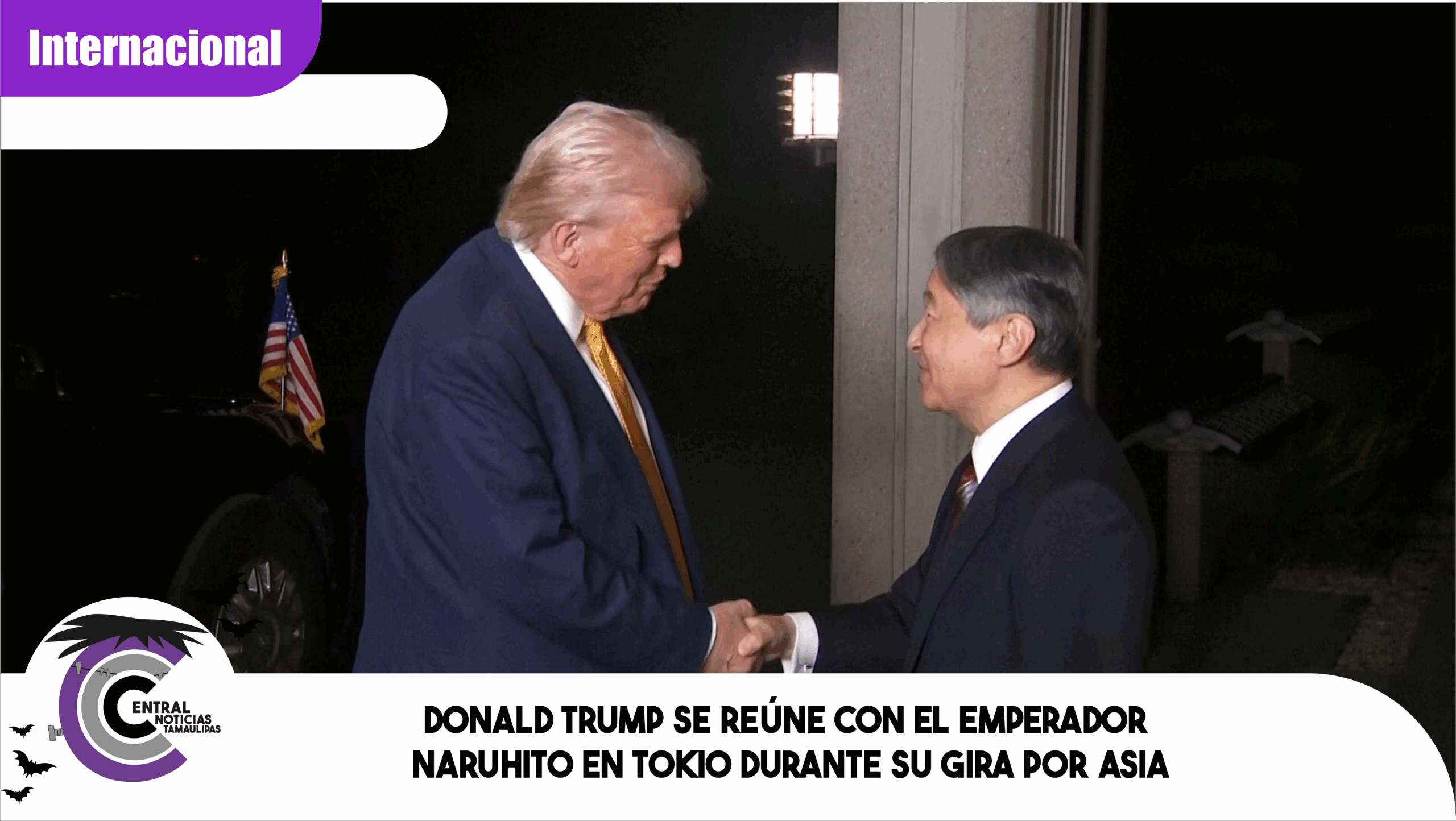 “Segunda parada: Japón. El presidente Donald J. Trump se reúne con el emperador Naruhito en el Palacio Imperial de Tokio”.