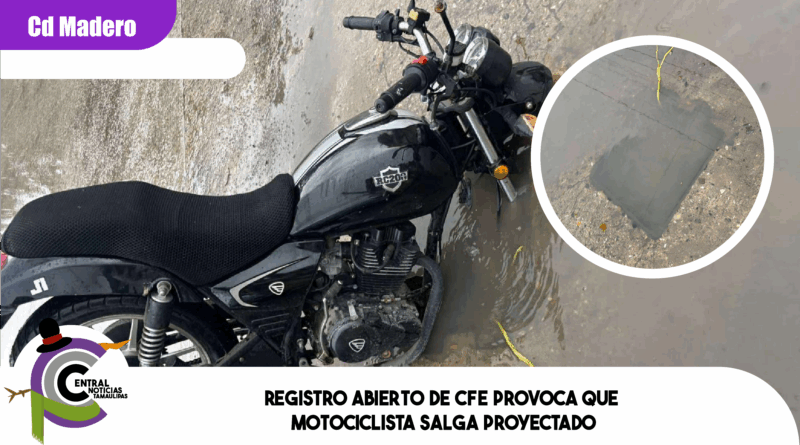 Ciudad Madero, Tamaulipas.-Un motociclista resultó lesionado luego de salir proyectado tras caer en un registro abierto de la Comisión Federal de Electricidad (CFE), en un percance ocurrido sobre la calle Necaxa.