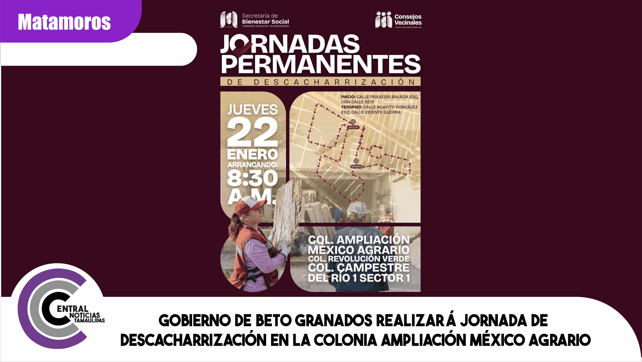 Matamoros, Tam.- El Gobierno de Beto Granados, a través de la Secretaría de Bienestar Social y en coordinación con los Consejos Vecinales, llevará a cabo las Jornadas Permanentes de Descacharrización este jueves 22 de enero, con el objetivo de prevenir enfermedades transmitidas por vectores y fortalecer la salud pública en Matamoros.