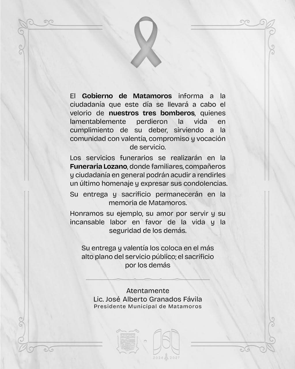 Con profundo respeto y dolor, el Gobierno de Matamoros, encabezado por el alcalde Beto Granados, informa que la ciudad despide a tres hombres cuya valentía, entrega y vocación de servicio dejaron una huella imborrable en la historia y el corazón de la comunidad.